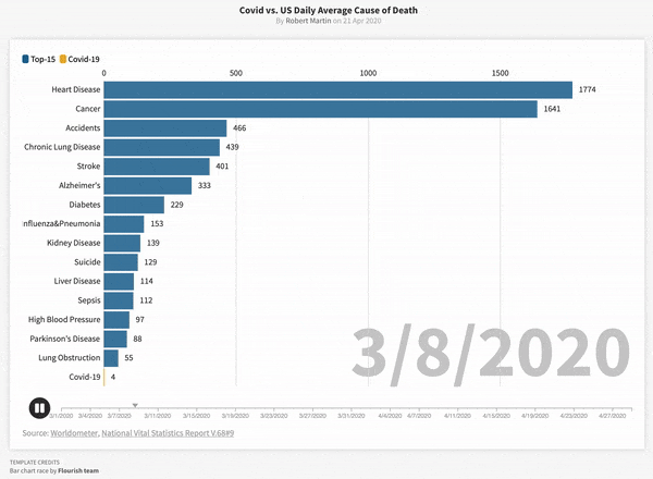 This animation from Flourish shows how COVID-19 overtook heart disease and cancer as the leading cause of death in the United States in early April. Click through to see a full-size version of the graphic.
